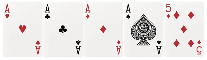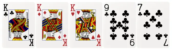 三張相同數字的牌,例如 6♣ 6♠ 6♥,搭配兩張不相關的牌。