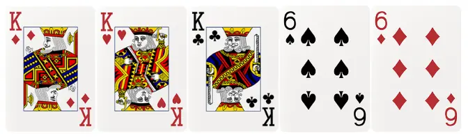 三張相同數字加上一對,例如 7♠ 7♥ 7♦ 3♣ 3♠。先比三張的點數,再比對子的點數。