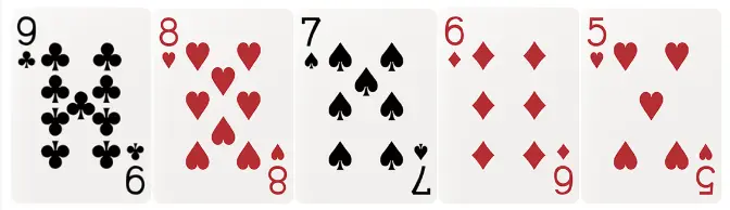 五張連號但不同花色的牌,例如 8♠ 7♦ 6♣ 5♣ 4♥。A 可當最大或最小使用。